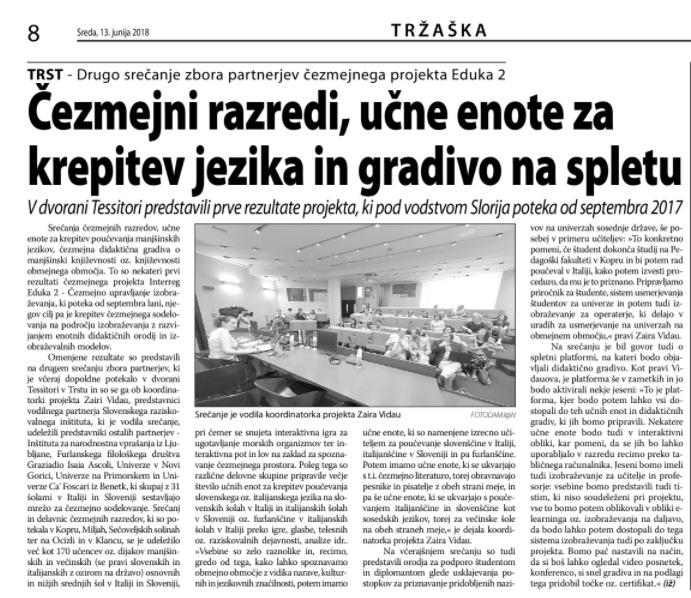 Articolo sul "Primorski dnevnik" del 13/06/2018: seconda Assemblea dei Partner e risultati finora raggiunti dal progetto.