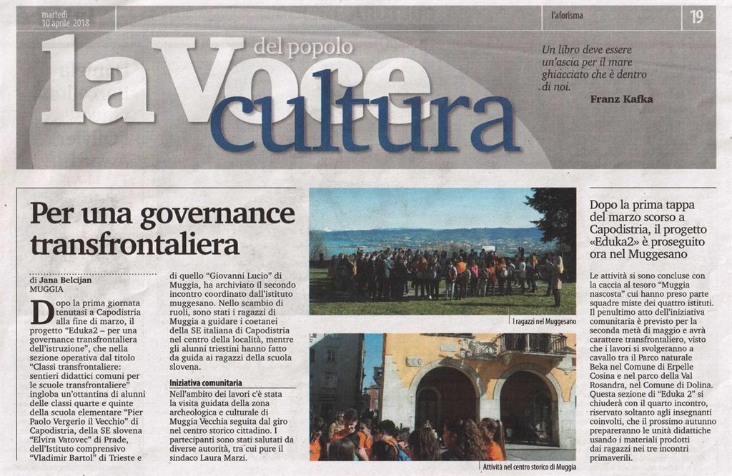 Articolo sulla Voce del Popolo in merito all'incontro transfrontaliero tra alunni delle scuole di Trieste, Muggia e Capodistria nell'ambito del progetto EDUKA 2 - Per una governance transfrontaliera dell'istruzione. L'incontro si è svolto a Muggia.