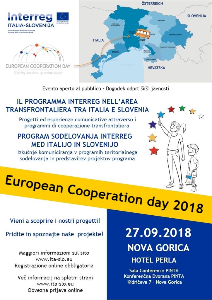 Il giorno 27 settembre 2018 a Nova Gorica il Programma di cooperazione Interreg V-A Italia–Slovenia 14-20 organizza, in occasione dell’European Cooperation Day (EC Day), l’evento “IL PROGRAMMA INTERREG NELLA AREA TRANSFRONTALIERA TRA ITALIA E SLOVENIA - Progetti ed esperienze comunicative attraverso i programmi di cooperazione transfrontaliera”. Un’occasione per conoscere il programma Interreg Italia-Slovenia e l’impatto che i progetti finanziati hanno sull’area transfrontaliera tra Italia e Slovenia.