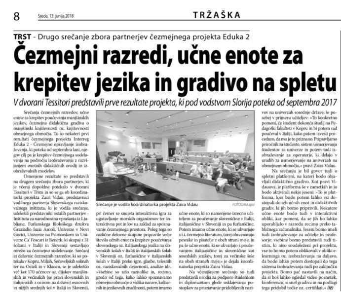 Articolo sul "Primorski dnevnik" del 12/06/2018: seconda Assemblea dei Partner.