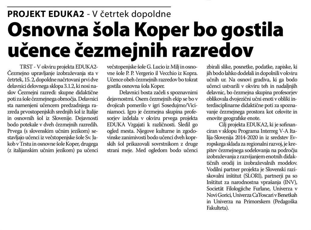 Articolo "Osnovna šola Koper bo gostila učence čezmejnih razredov"