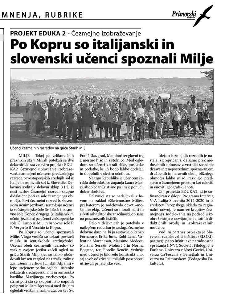 Članek o srečanju čezmejnih razredov, ki jih sestavljajo šole iz Trsta, Milj in Kopra. Srečanje je bilo v Miljah.